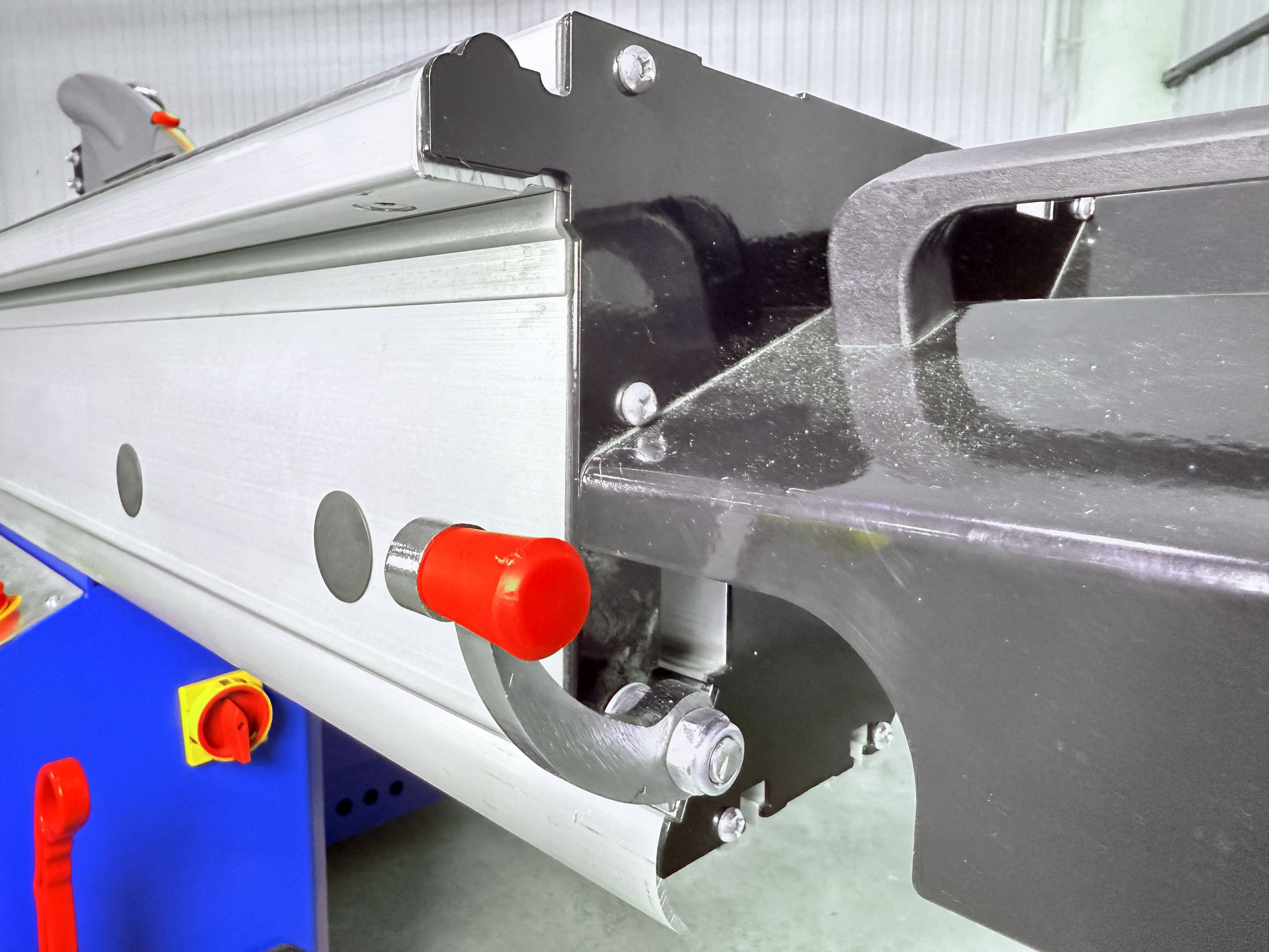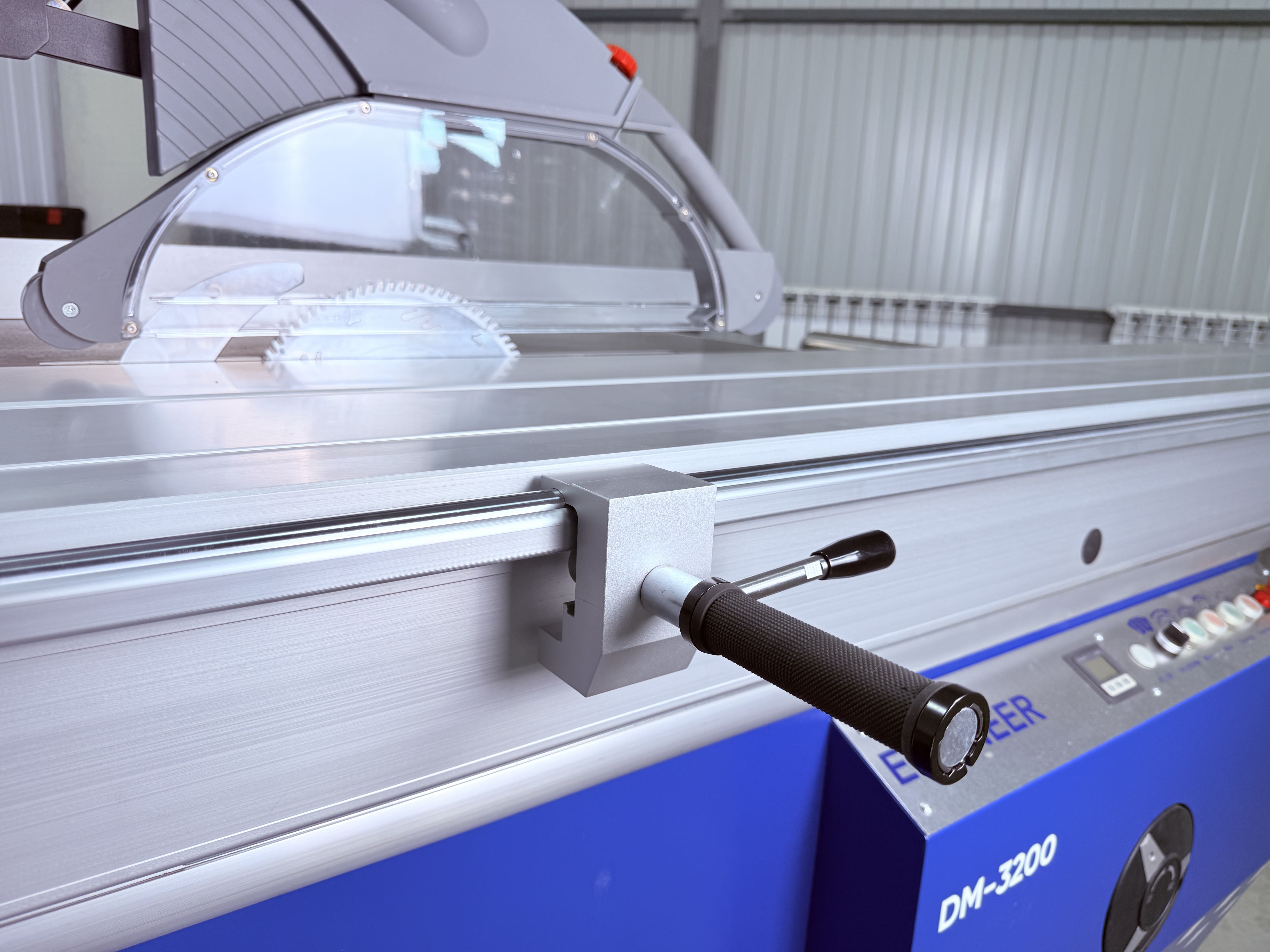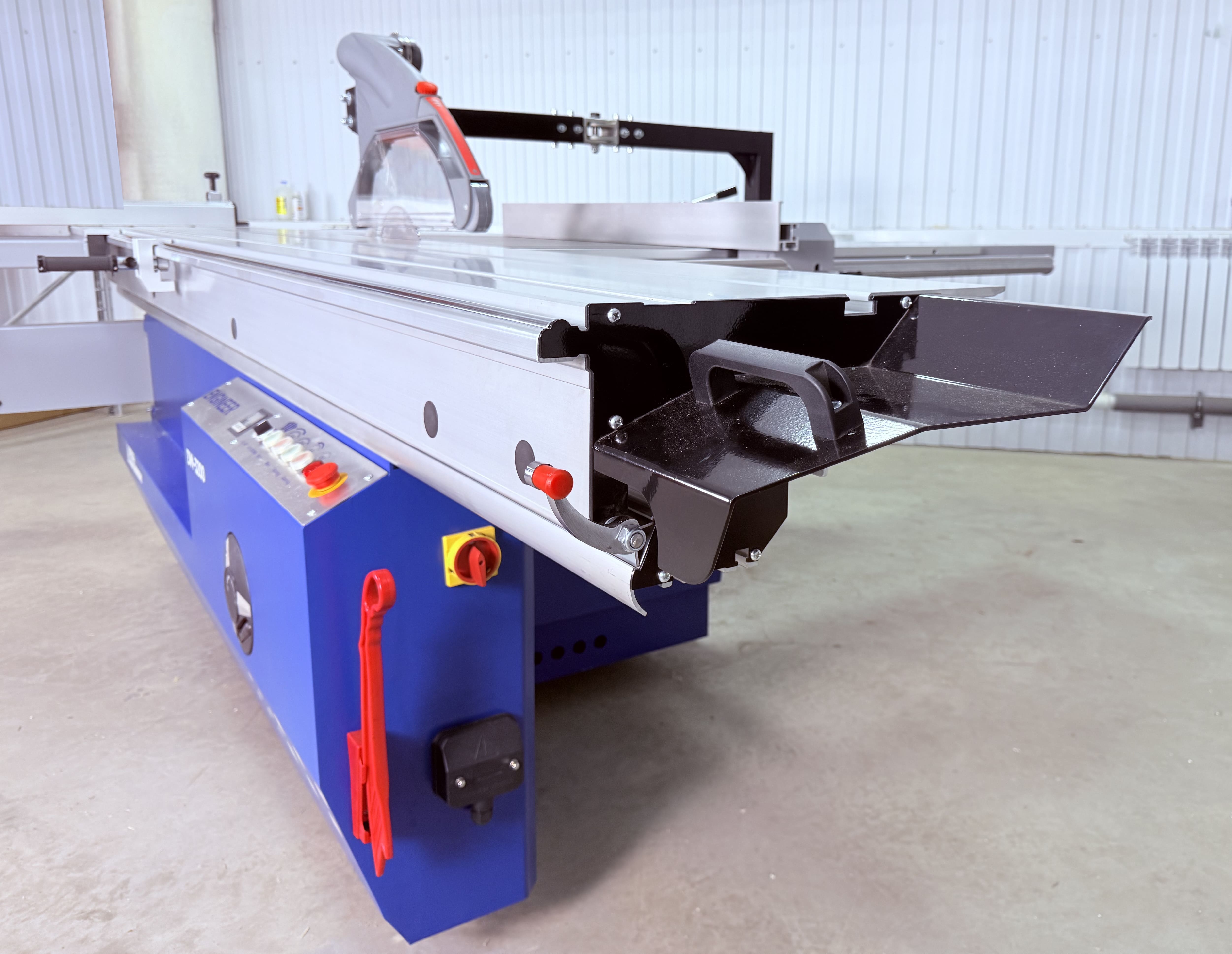 Стальные цилиндрические направляющие обеспечивают высочайшую точность и качество распиловки. Практика основных производителей показывает, что на сегодняшний день такой тип каретки наиболее надежен, долговечен и практически не требует технического обслуживания. Поверхность каретки анодирована, имеет высокую сопротивляемость истиранию и не пачкает светлые заготовки. Ширина опорной поверхности каретки 465 мм наибольшая в классе. Двухслойная алюминиевая каретка с усиленной рамой и встроенной металлической планкой, ширина 465 мм для очень стабильной и точной подачи. Строгий в каждой детали Закалка ролика держателя раздвижного стола обеспечивает его долговечность, допуск 0,01 мм на длине 2 метра обеспечивает абсолютную точность скольжения стола.
