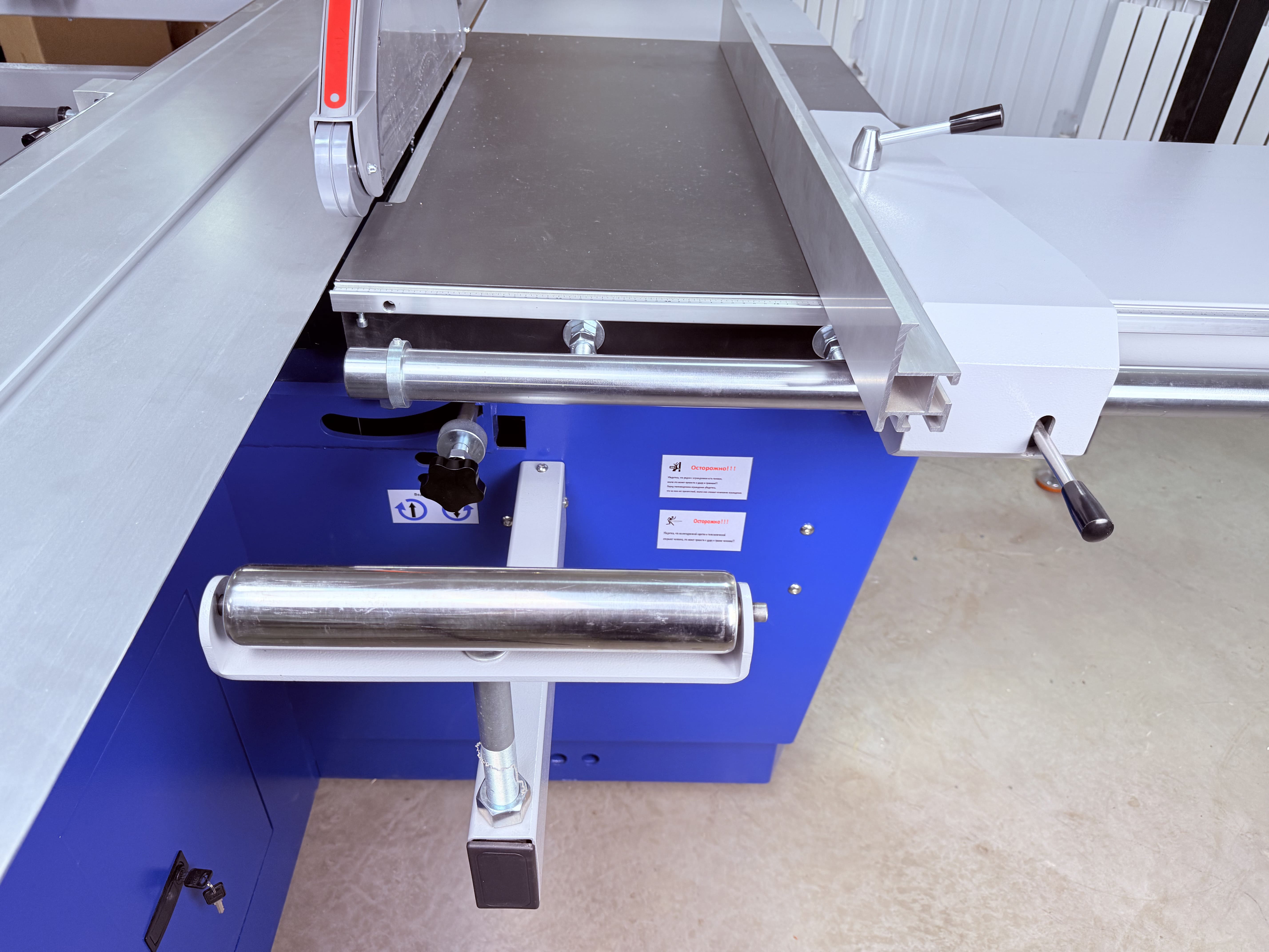 Опорный стол можно передвигать и быстро фиксировать с помощью мощного зажима. Система настройки и регулировки диагоналей, выполненная с 2х сторон стола, позволяет применять схему раскроя на мелкие детали «от себя», так как это выполнено на станках ведущих европейских производителей.