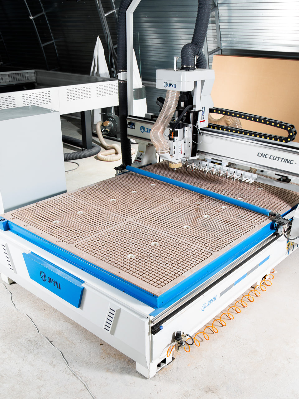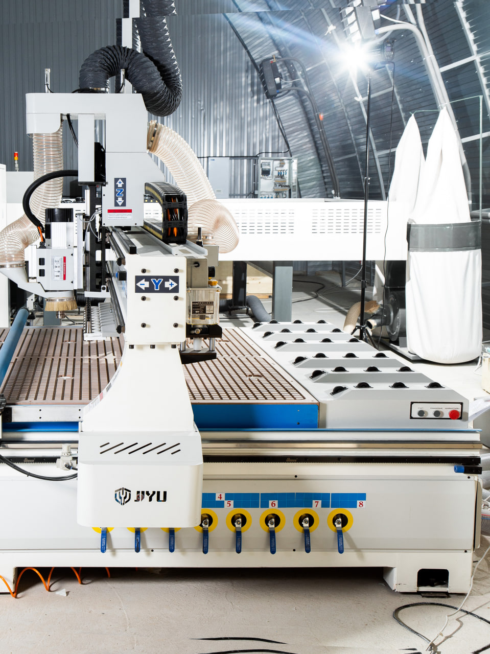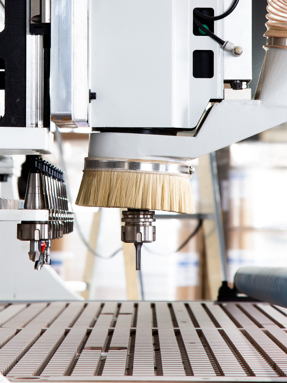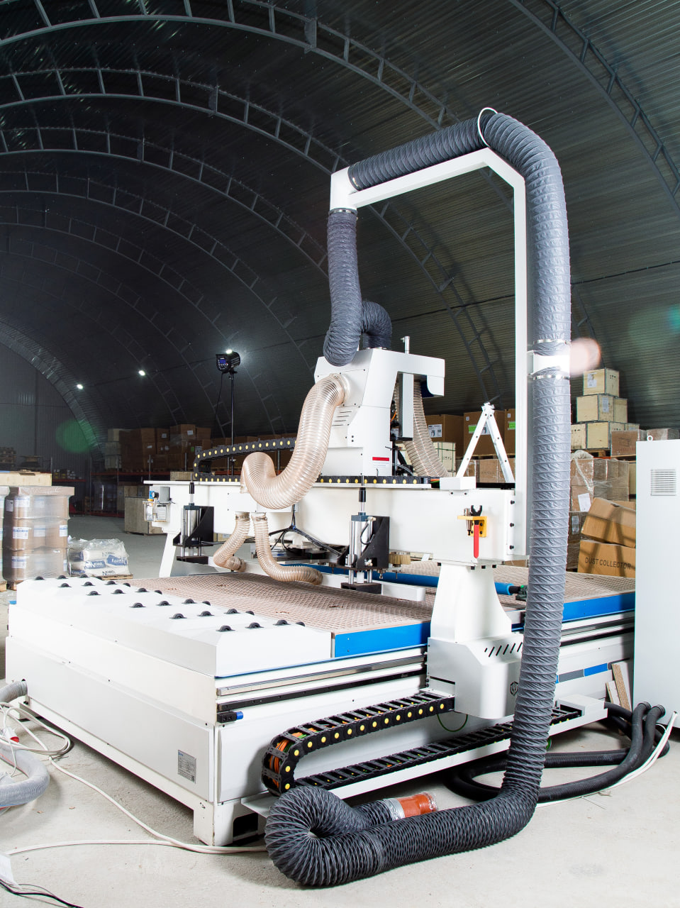 Опционально станок может быть оснащен автоматической системой загрузки материала, представляющей собой вакуумные загрузчики, работающие от пневматики и загрузочный стол. Опция может быть заказана в двух комплектациях, стол + загрузчики, либо отдельно загрузчики интегрированные на портале станка.