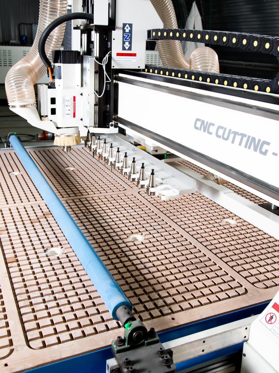 Для удобства загрузки обрабатываемых листов материала на стол предусмотрены специальные ролики. Кроме того, станок в базовом исполнении оснащен системой разгрузки, которая сталкивает обработанные детали и очищает стол от стружки. Всё это в целом ускоряет процесс производства.