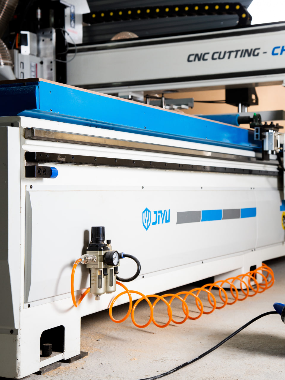 Станок оснащен пневматическими упорами для точного и быстрого позиционирования детали.
