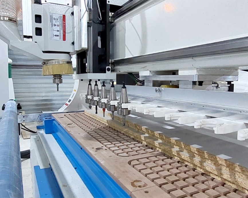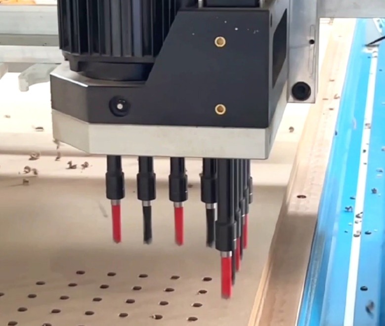 Сверлильная группа на 9 независимых инструментов по оси X и Y позволяет производить плоскостную присадку с высокой точностью и скоростью.