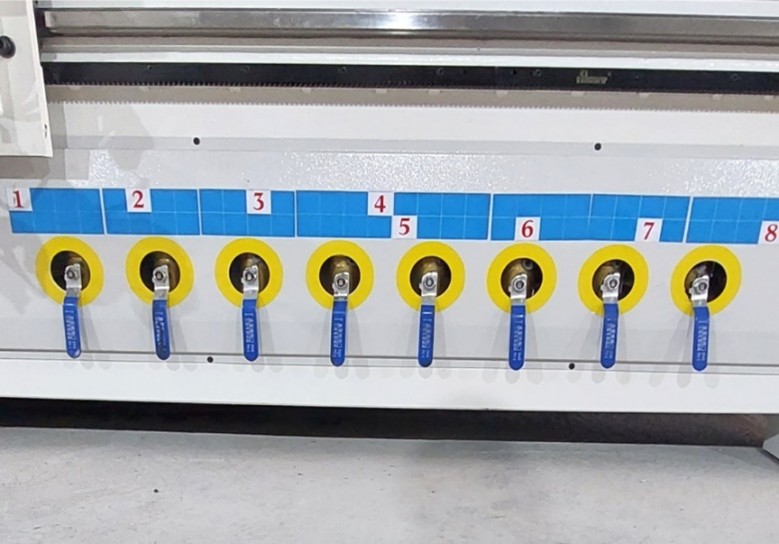 Станок оснащен пневматическими упорами для точного и быстрого позиционирования детали.