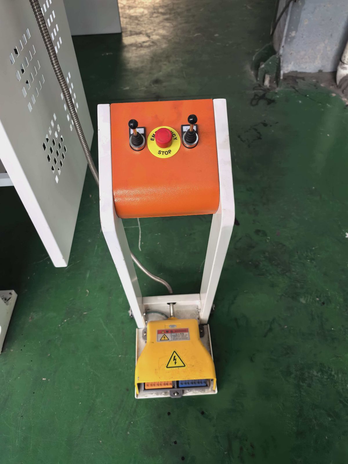 Листогибочный гидравлический пресс укомплектован выносным, ножным модулем управления. Модуль имеет две педали – для подачи верхней плиты вниз, и отвода в первоначальное положение – вверх.