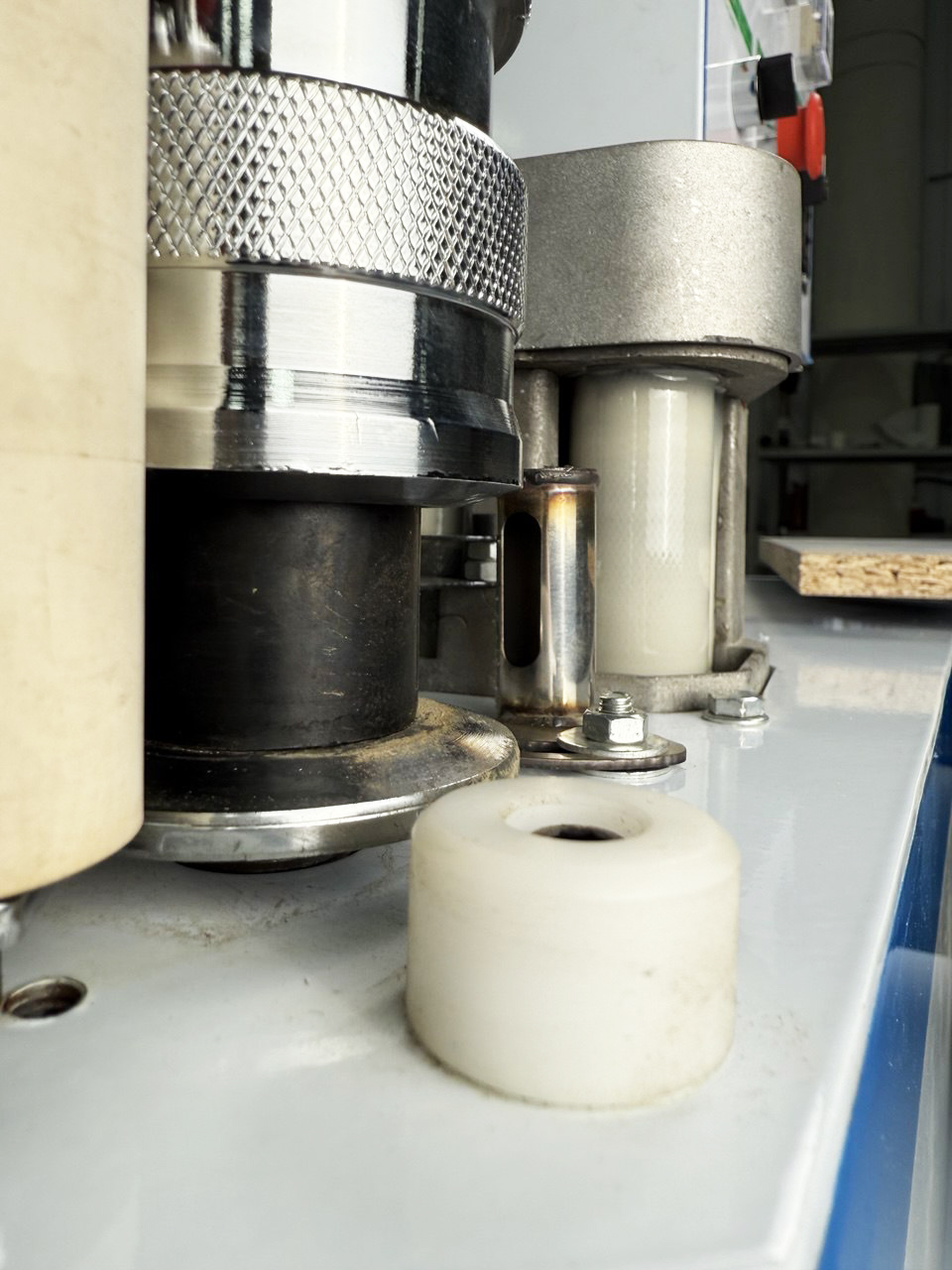 Дополнительный прижимной ролик на пружине для качественного приклеивания внутренних и наружних радиусов кромочным материалом
