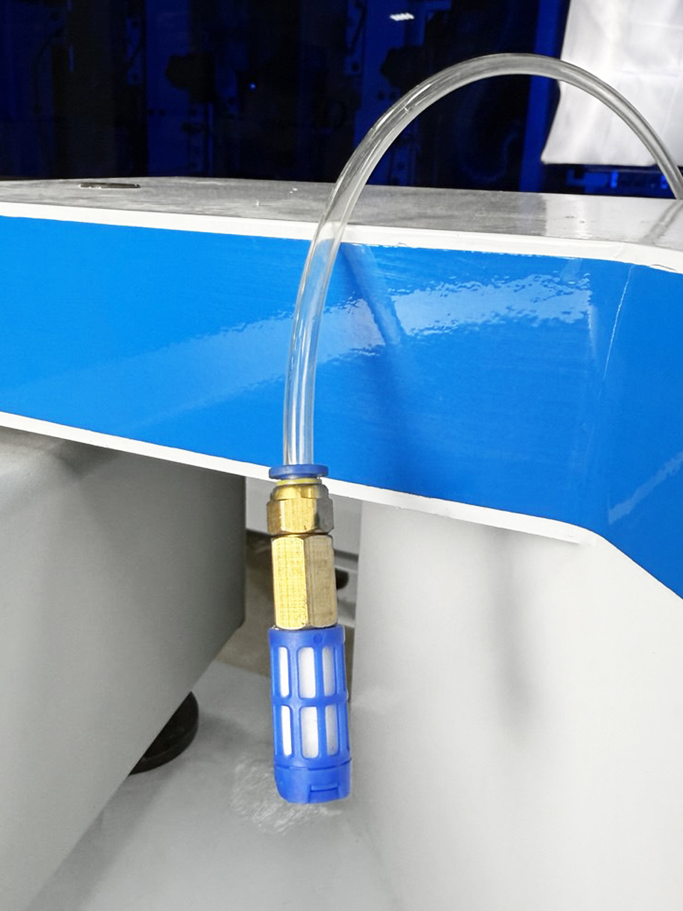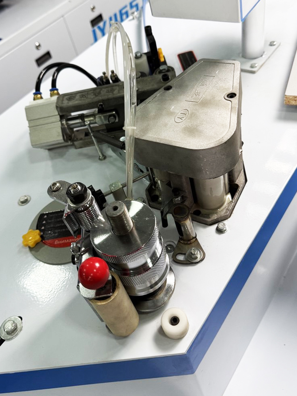 Подает жидкость распылом в зону прижимного ролика, предотвращая налипание остатков клея при совмещении детали с кромкой, что значительно улучшает качество приклеивания