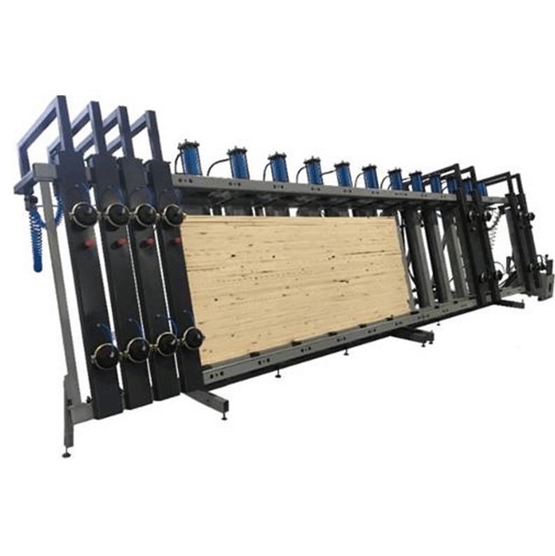 Вайма гидравлическая оснащена откатными пневматическими фронтальными прижимами. Их перемещение за пределы рабочей зоны обеспечивает свободный доступ при укладке и выгрузке. Откатные пневматические фронтальные прижимы гарантированно выравнивают и удерживают пакет заготовок во время прессования.